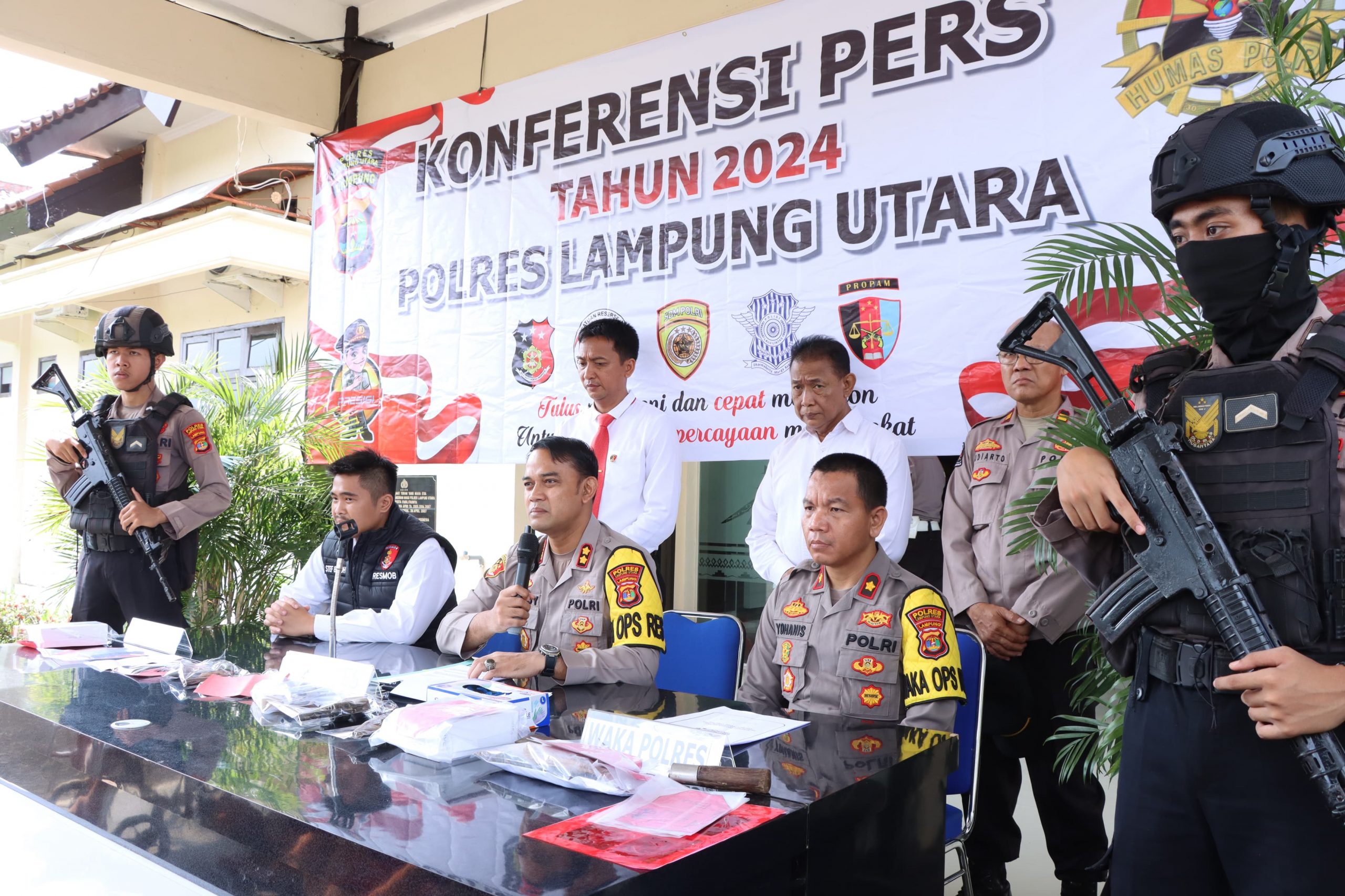 “Tidak hanya mengamankan pelaku jajaran Polres Lampung Utara juga berhasil mengamankan bermacam-macam barang bukti seperti mobil 1 unit, sepeda motor 18 unit, Hp 15 unit, senpi 5 pucuk, amunisi 42 butir, sajam 2 bilah, emas 4 gram dan lain-lain 127 buah,” Kata Kapolres.