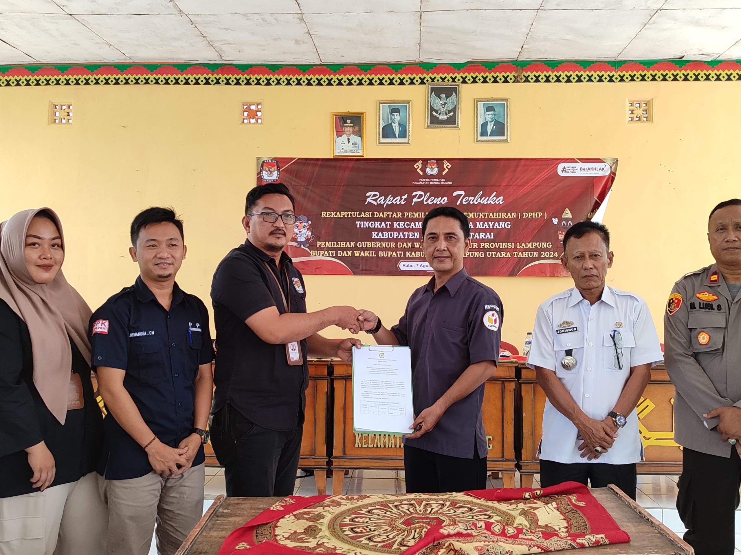 Dalam rangka pengawasan pada tahapan penyusunan daftar pemilih untuk pemilihan serentak 2024, Panwaslu Kecamatan Bunga Mayang hadir pada acara rapat Pleno Rekapitulasi Daftar Pemilih Hasil Pemutakhiran (DPHP) yang diselenggarakan oleh Panitia Pemilihan Kecamatan (PPK) Kecamatan Bunga Mayang di Aula Kecamatan Bunga Mayang, Rabu (7/8/24).