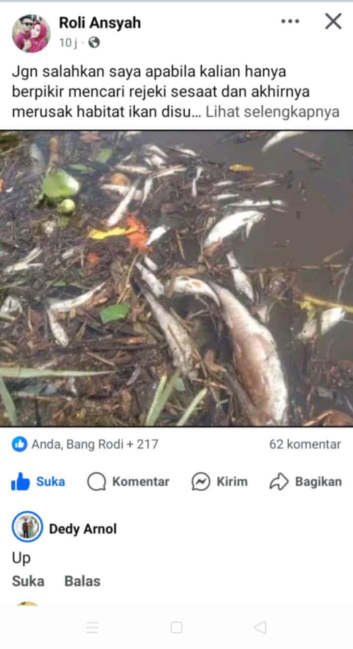 “Jangan salahkan saya apabila kalian hanya berpikir mencari rezeki sesaat dan akhirnya merusak habitat ikan di sungai dengan cara meracun ikan. Tolong warga Waysido kompak ya, apabila mengetahui ada warga yang meracuni ikan di sungai terutama dari Taman Faiz naik ke atas, laporkan. Insya Allah saya pastikan akan kita penjarakan. 🙏🙏🙏“