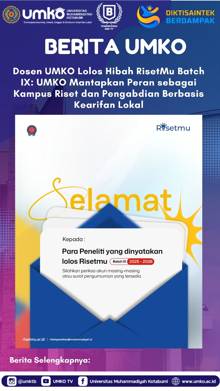 Universitas Muhammadiyah Kotabumi (UMKO) kembali mencatat prestasi membanggakan melalui keberhasilan sejumlah dosennya yang dinyatakan lolos sebagai penerima Hibah RisetMu Batch IX. Pengumuman ini disampaikan melalui Surat Nomor 2015/I.3/D/2025 setelah melalui Rapat Pleno Tim Hibah RisetMu Majelis Pendidikan Tinggi Penelitian dan Pengembangan (Diktilitbang) Pimpinan Pusat Muhammadiyah.